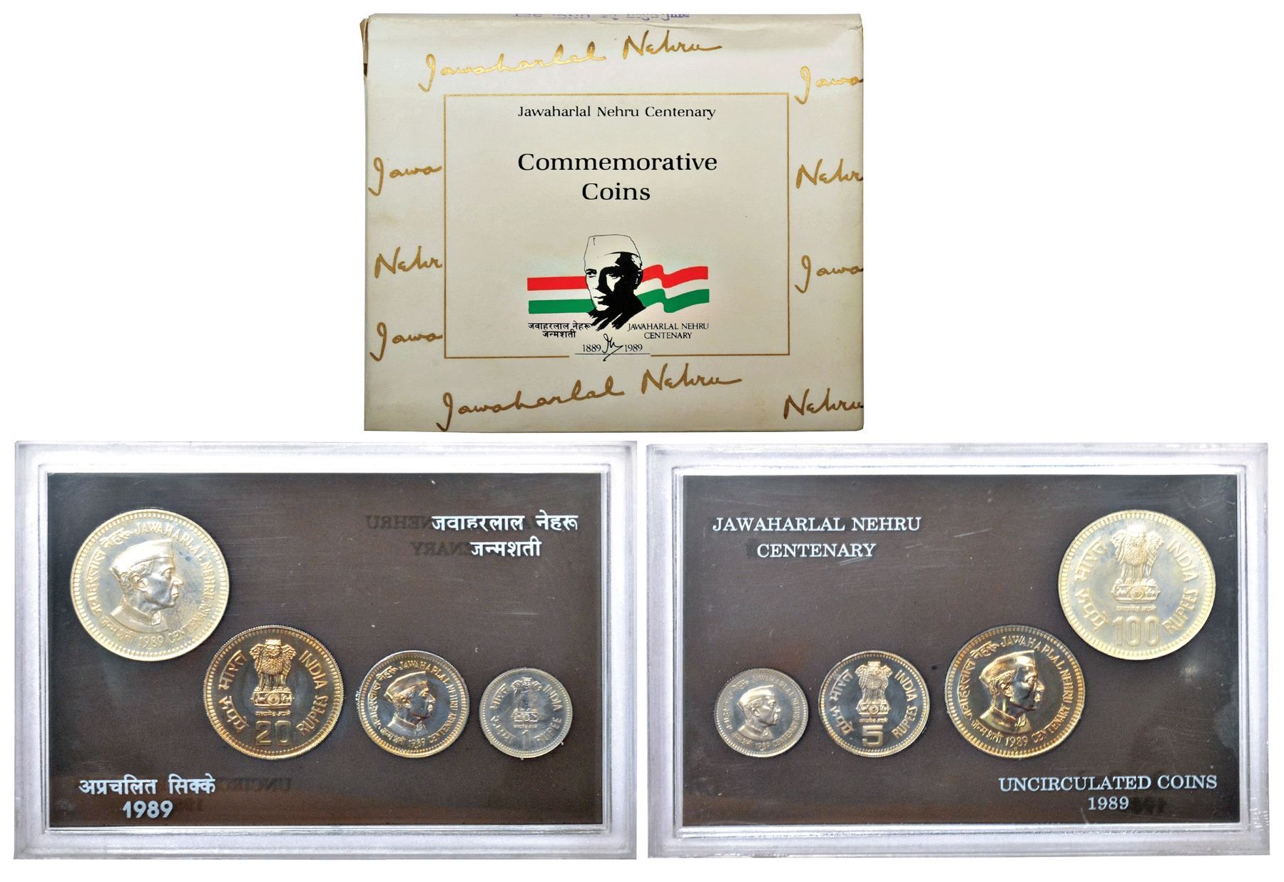 1989, Jawaharlal Nehru birth centenary, UNC set of 4 coins, 100 rupees, 20 rupees, 5 rupees and 1 rupees, Bombay mint, RB 138, in original mint packing.