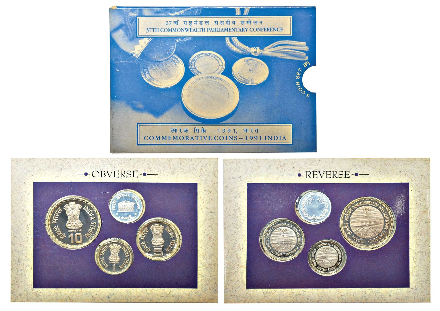 1991, 37th Commonwealth Parliamentary Conference, Proof set of 3 coins, 10 rupees, 5 rupees and 1 rupee, Bombay mint, RB 143, in original mint packing.