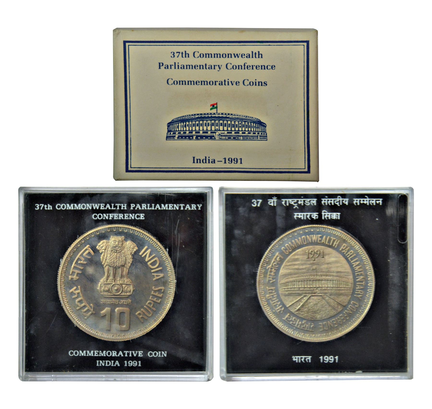 1991, 37th Commonwealth Parliamentary Conference, Proof set of single coin, 10 rupees, Bombay mint, RB 148, in original mint packing.