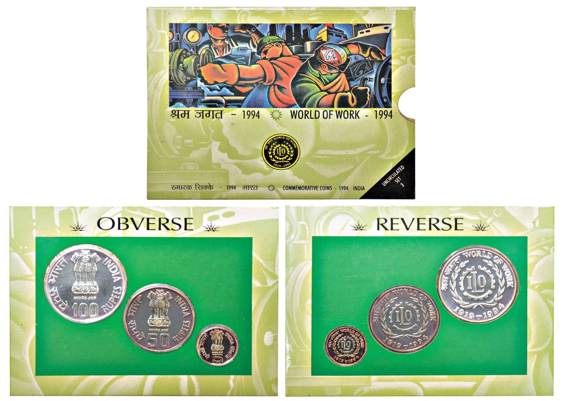 1994, World of Work, UNC set of 3 coins, 100 rupees, 50 rupees and 5 rupees, Bombay mint, RB 175, in original mint packing.