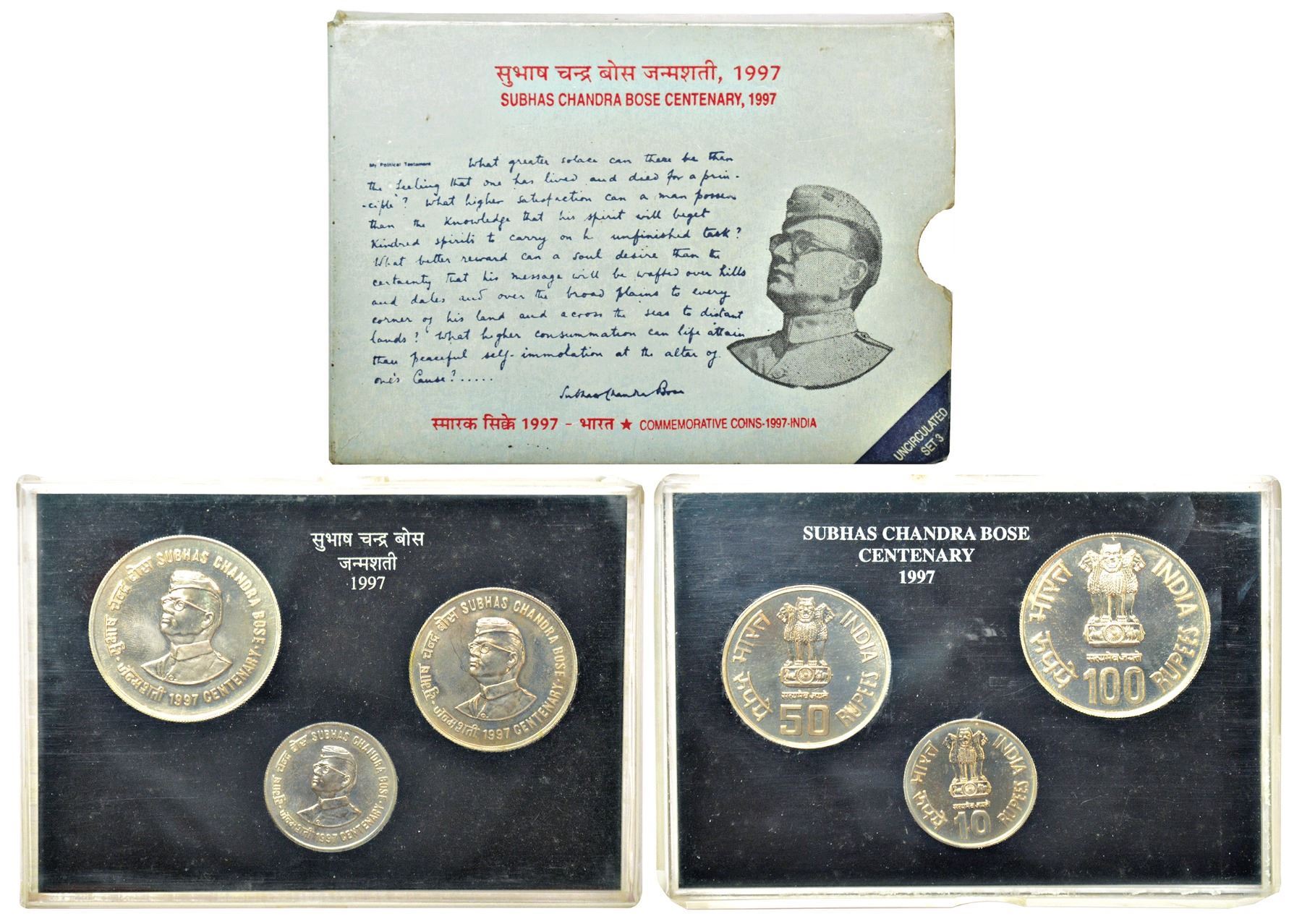1997, Netaji Subhas Chandra Bose, UNC set of 3 coins, 100 rupees, 50 rupees and 10 rupees, Calcutta mint, RB 194, in original mint packing.