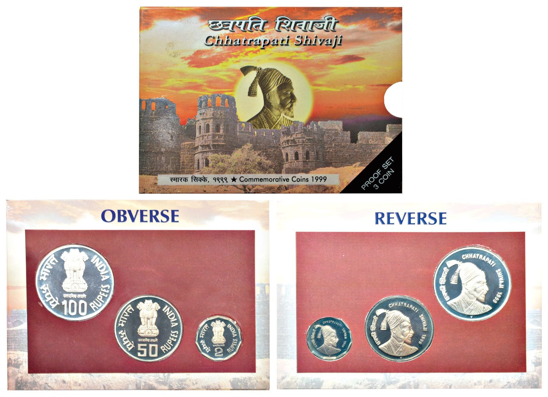 1999, Chhatrapati Shivaji, Proof set of 3 coins, 100 rupees, 50 rupees and 2 rupees, Mumbai mint, RB 220, in original mint packing.