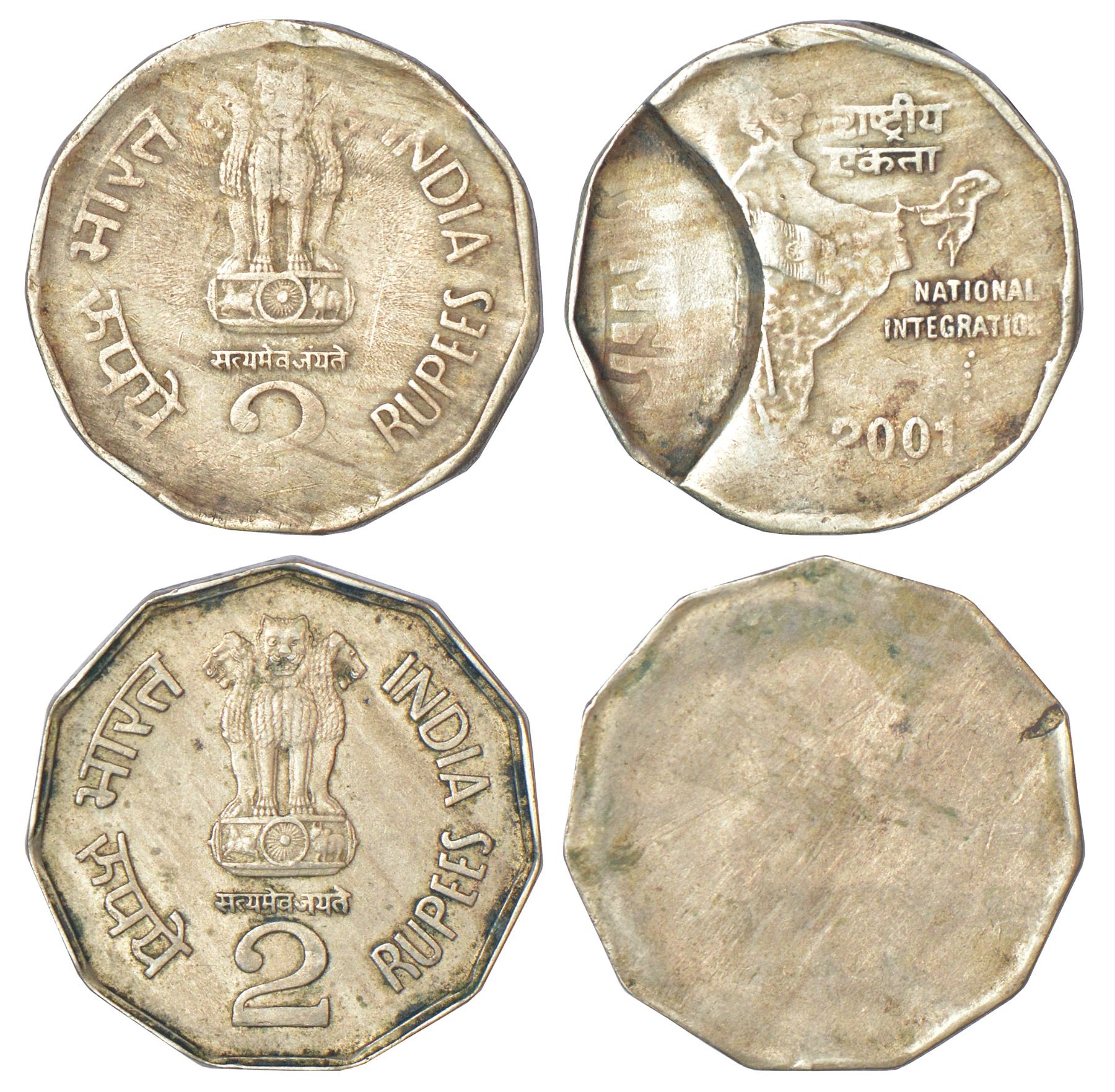 Republic of India, 2 rupees, cupro-nickel, misprint coins (2), 1x 2001, double struck on reverse, 6.00g and 1x reverse blank, 6.03g. (2 coins)