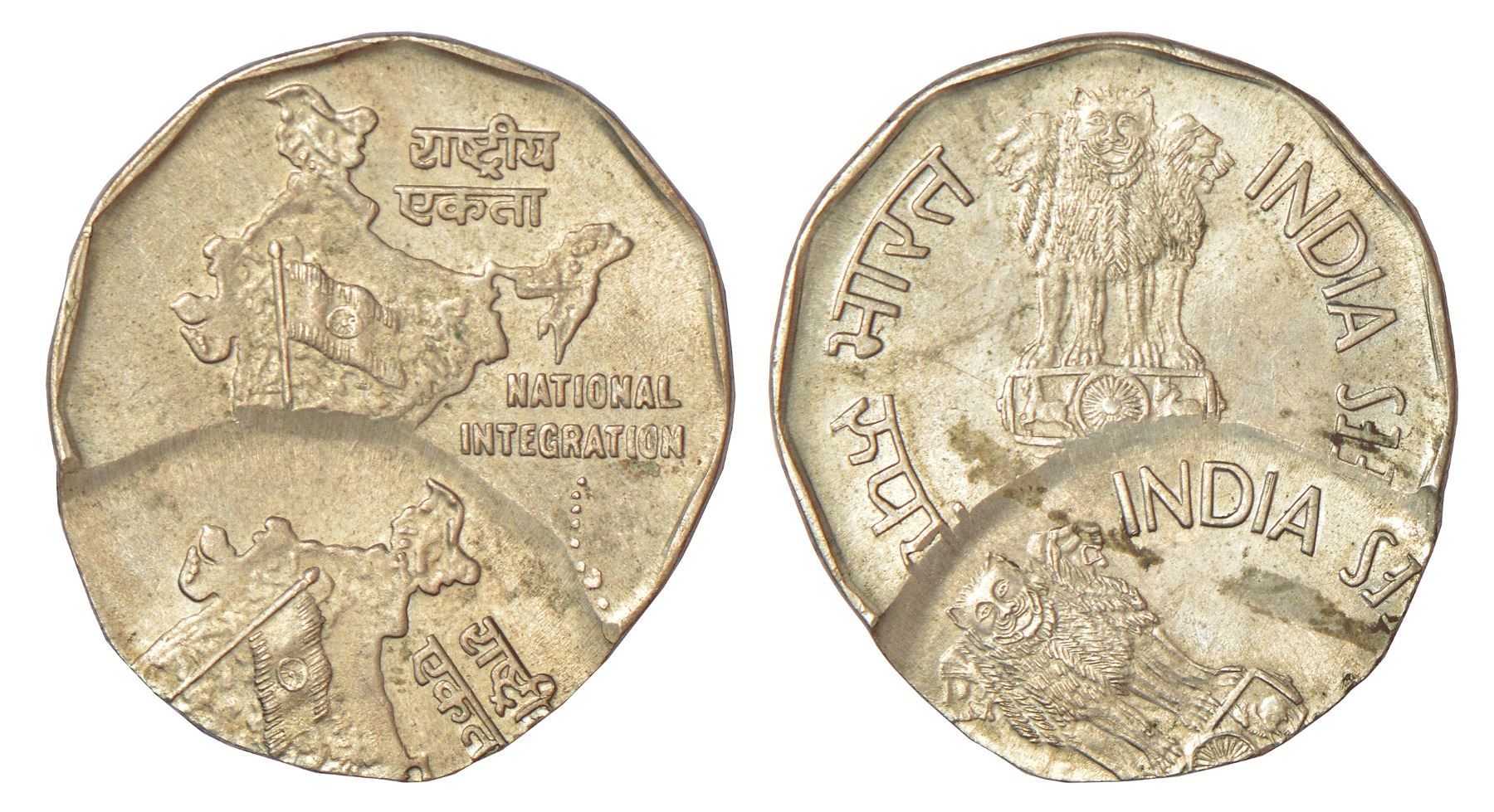 Republic India: 2 rupees, error, copper-nickel, (1992-2004), double struck on both sides, 6.25g.