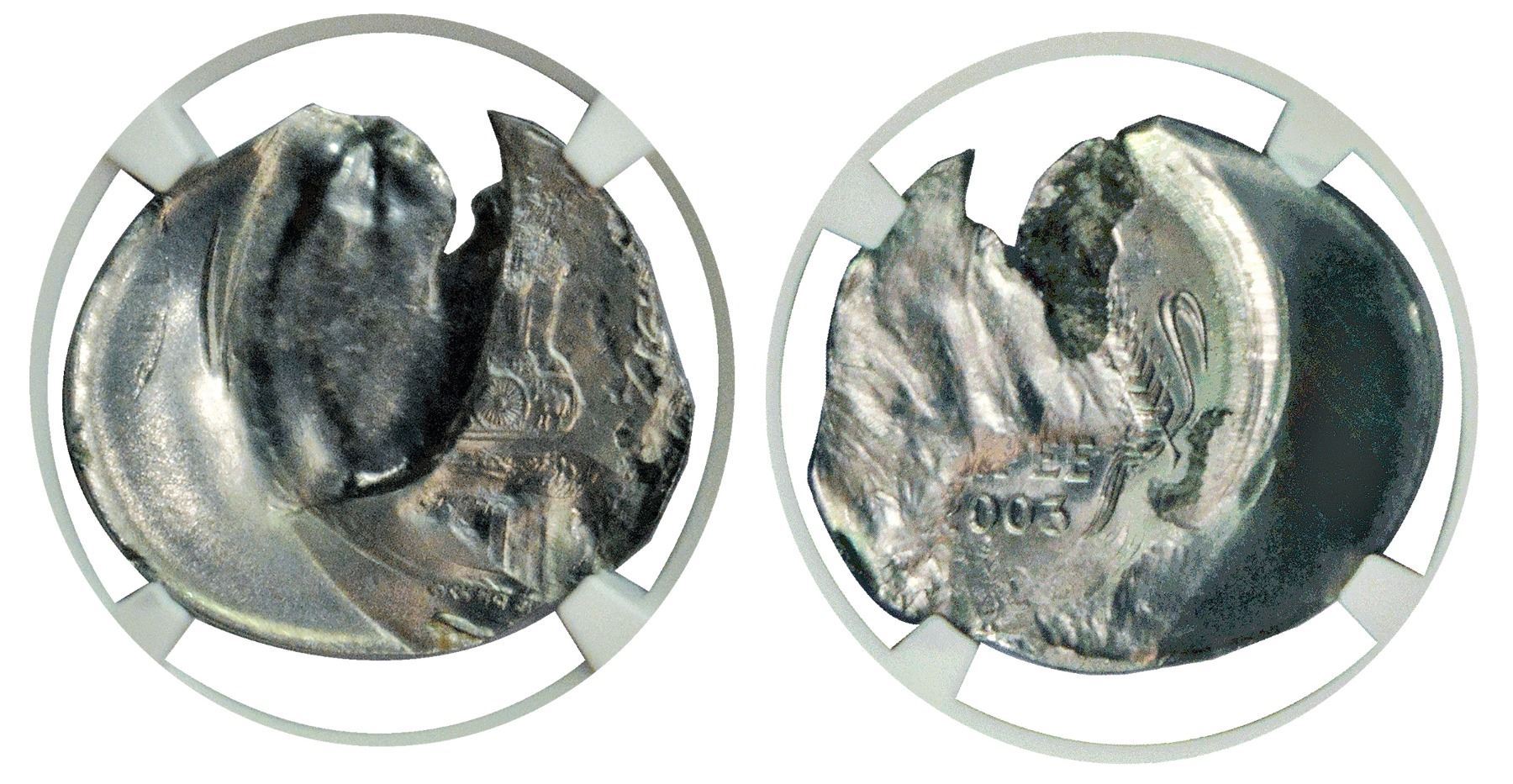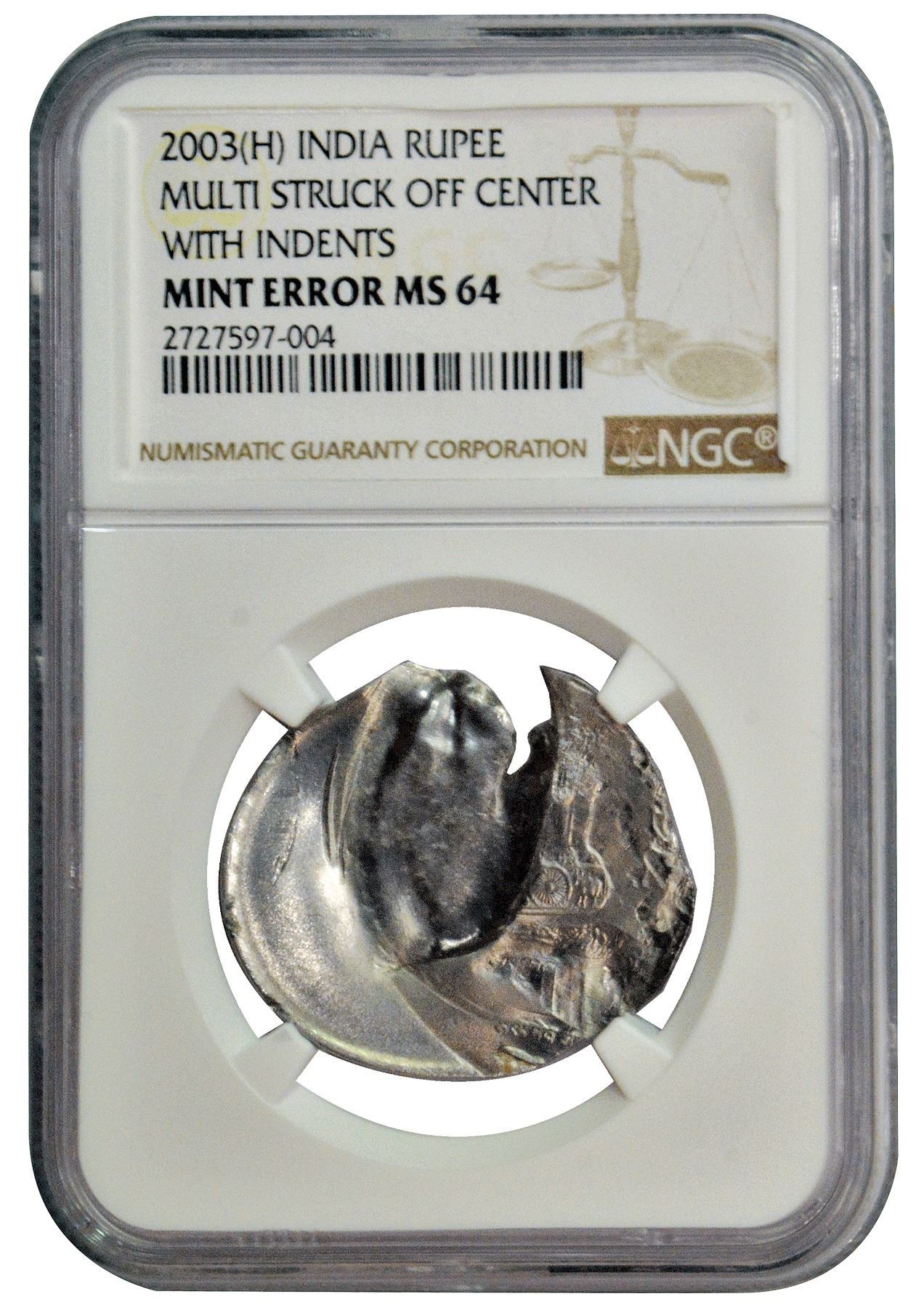 2003, Ferratic stainless steel, 1 rupee, error, off centre and multiple struck on both sides.