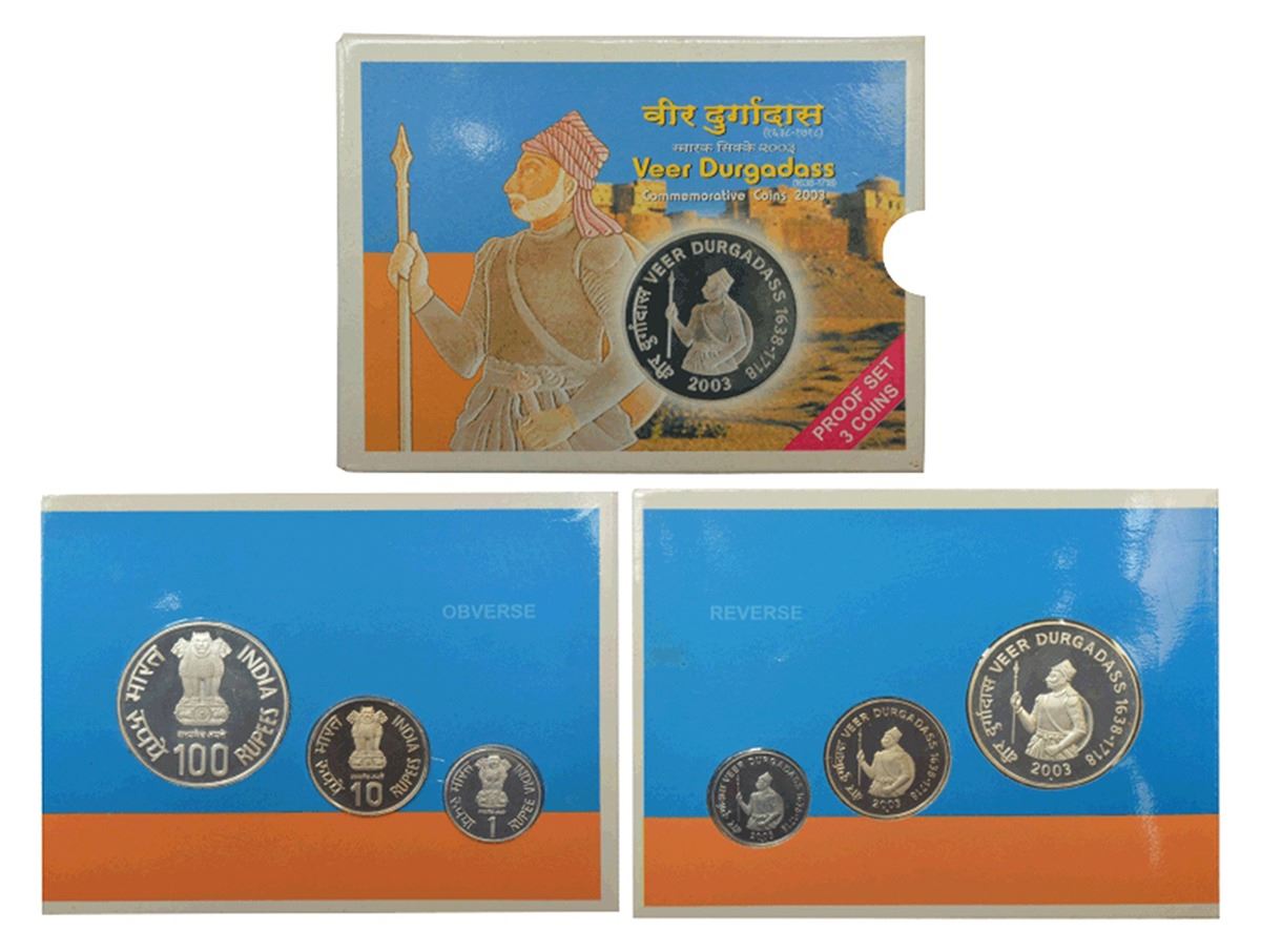 2003, Veer Durgadas, Proof set of 3 coins, 100 rupees, 10 rupees and 1 rupee, Mumbai mint, RB 258, in original mint packing.