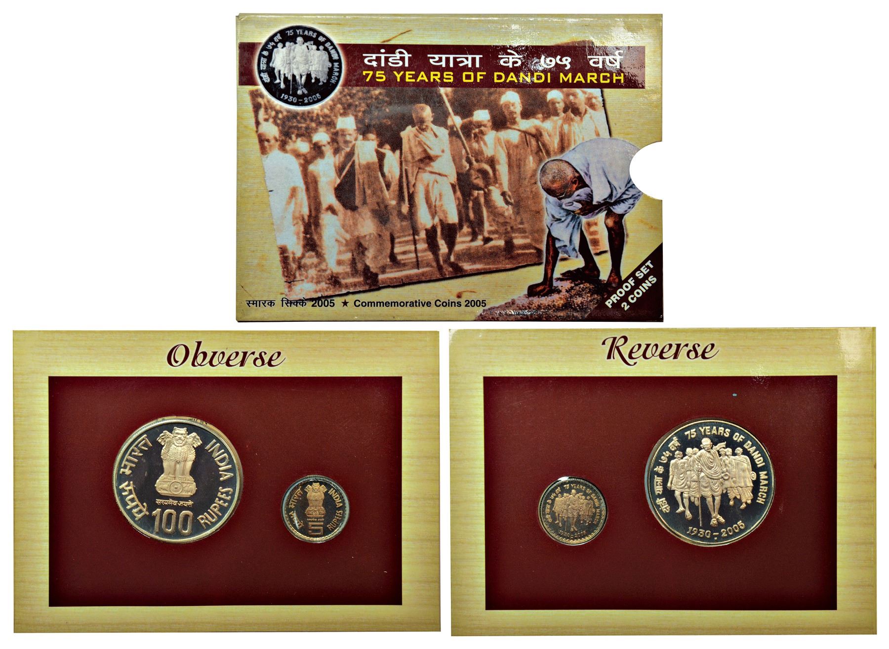 2005, 75 Years of Dandi March, Proof set of 2 coins, 100 rupees and 5 rupees, Mumbai mint, RB 287, in original mint packing.