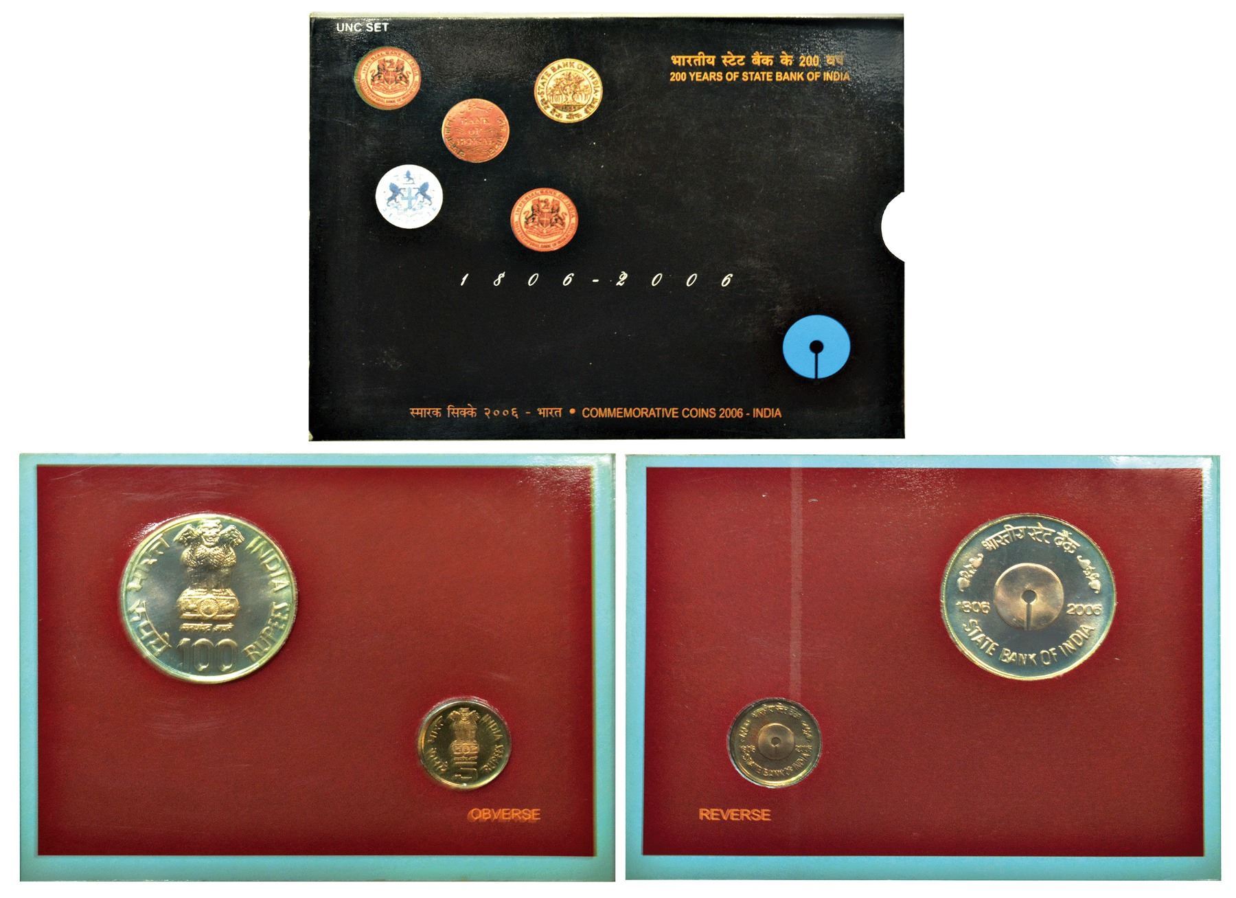 2006, 200 Years of State Bank of India, UNC set of 2 coins, 100 rupees and 5 rupees, Kolkata mint, RB 298, in original mint packing.