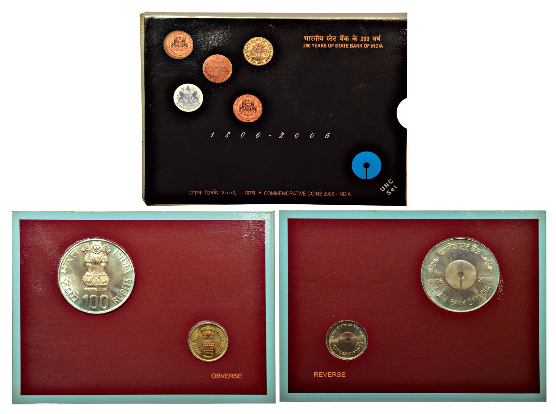 2006, 200th years of State Bank of India, UNC set of 2 coins, 100 rupees and 5 rupees, Kolkata mint, RB 298, in original mint packing.