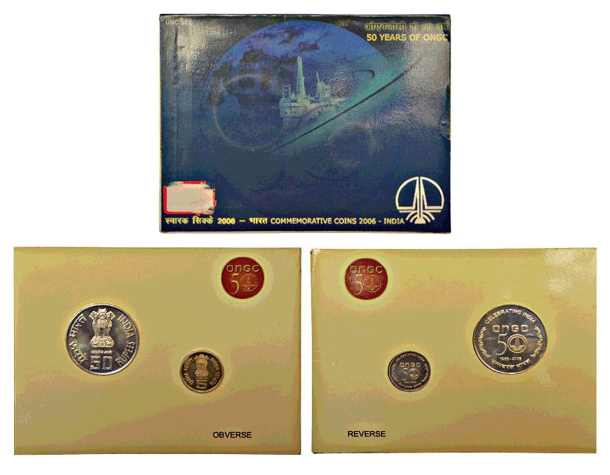 2006, 50 Years of ONGC, UNC set of 2 coins, 50 rupees and 5 rupees, Kolkata mint, RB 308, in original mint packing.