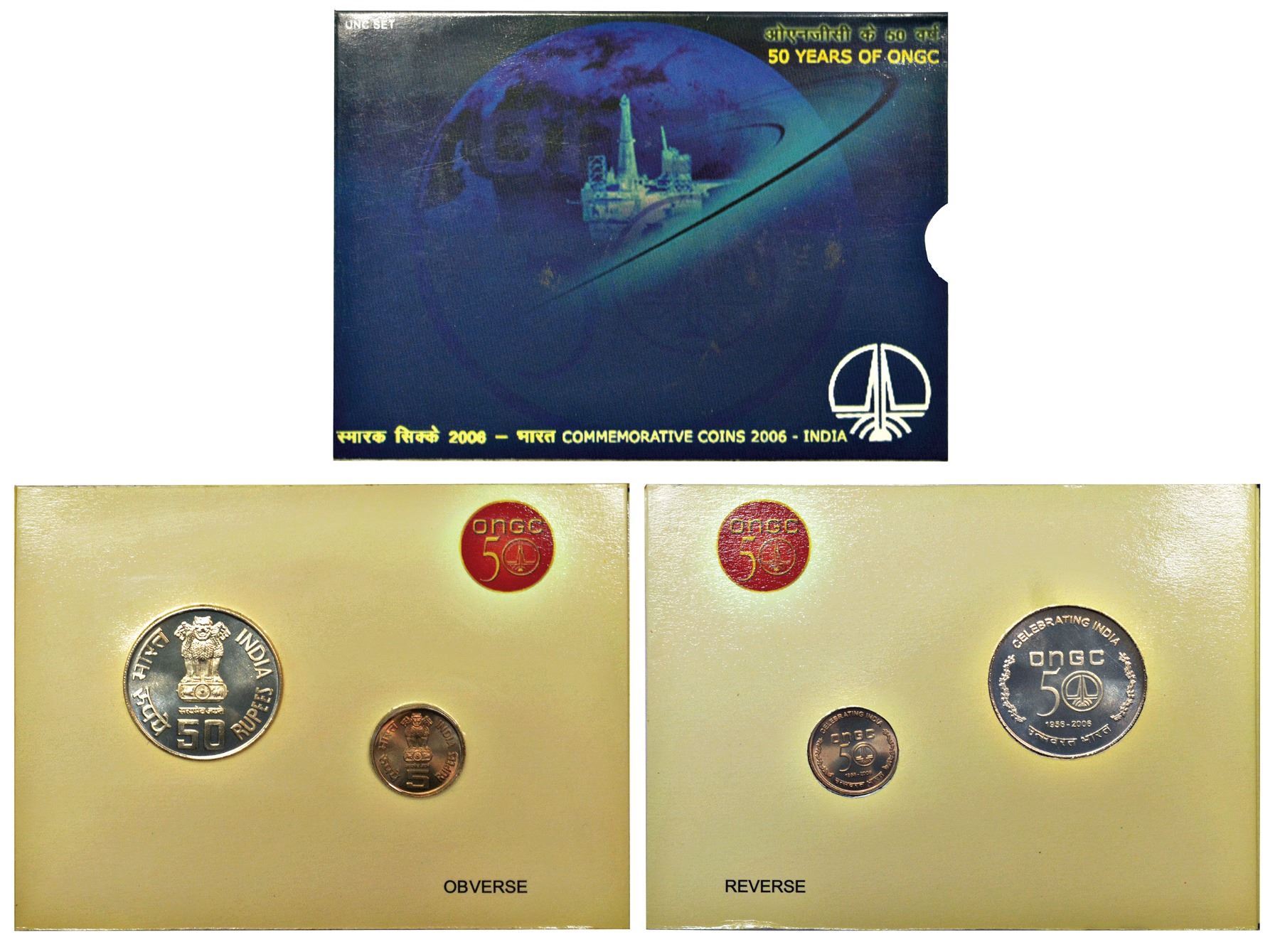 2006, 50 Years of ONGC, UNC set of 2 coins, 50 rupees and 5 rupees, Kolkata mint, RB 308, in original mint packing.