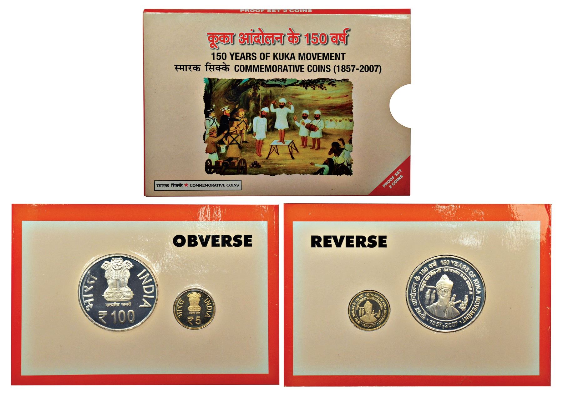 2007, 150 Years of Kuka Movement, Proof set of 2 coins, 100 rupees and 5 rupees, Mumbai mint, in original mint packing.