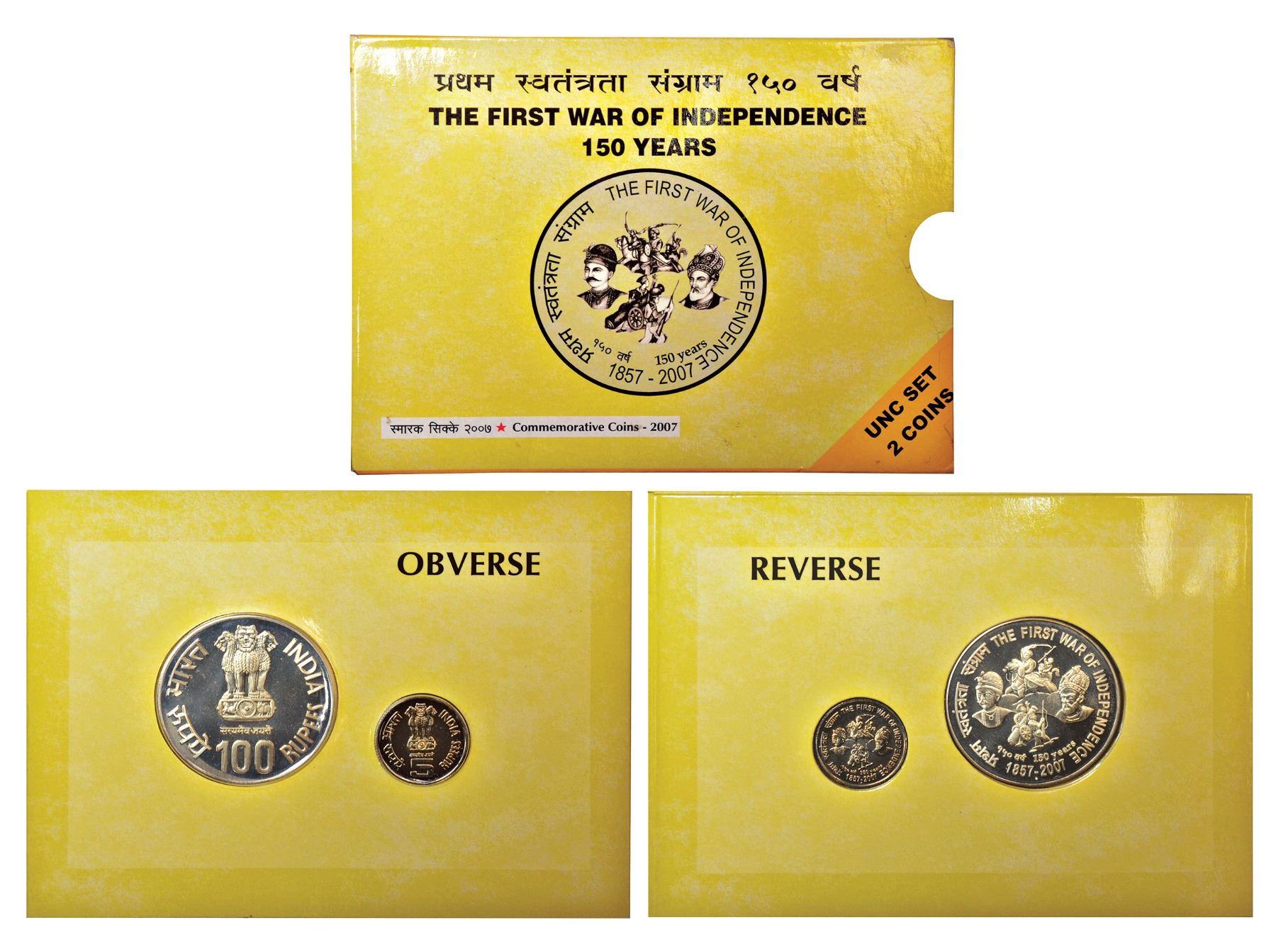 2007, 150 Years of The First War of Independence, UNC set of 2 coins, 100 rupees and 5 rupees, Mumbai mint, RB 321,
