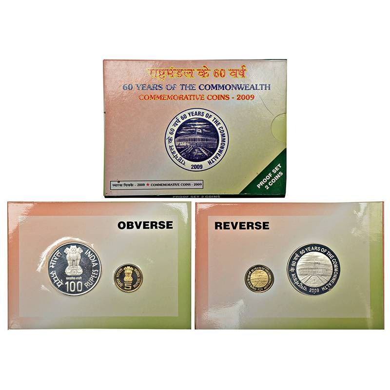 2009, 60 Years of the Commonwealth, Proof set of 2 coins, 100 rupees and 5 rupees, Mumbai mint, RB 362, in original mint packing.