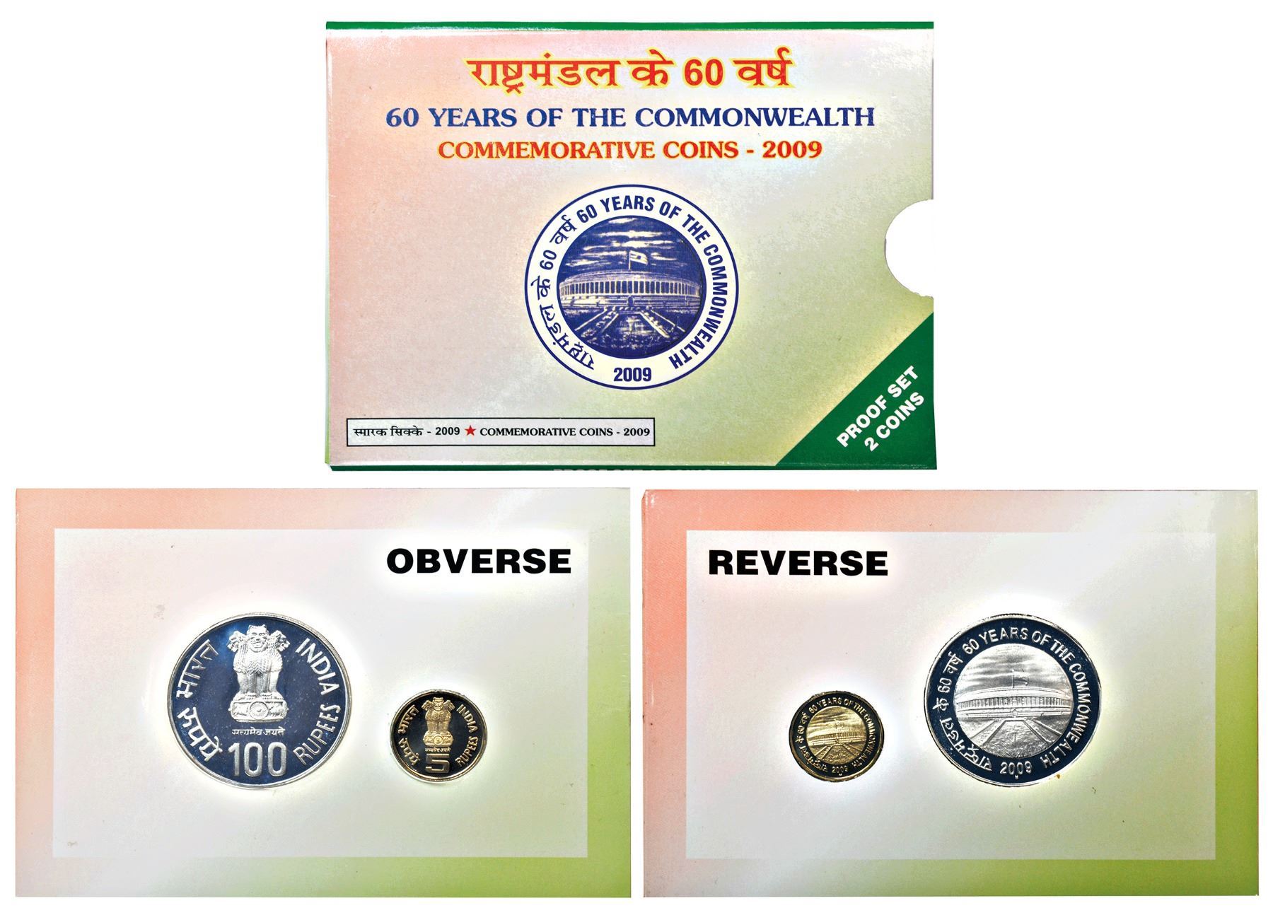 2009, 60 Years of the Commonwealth, Proof set of 2 coins, 100 rupees and 5 rupees, Mumbai mint, RB 362, in original mint packing.