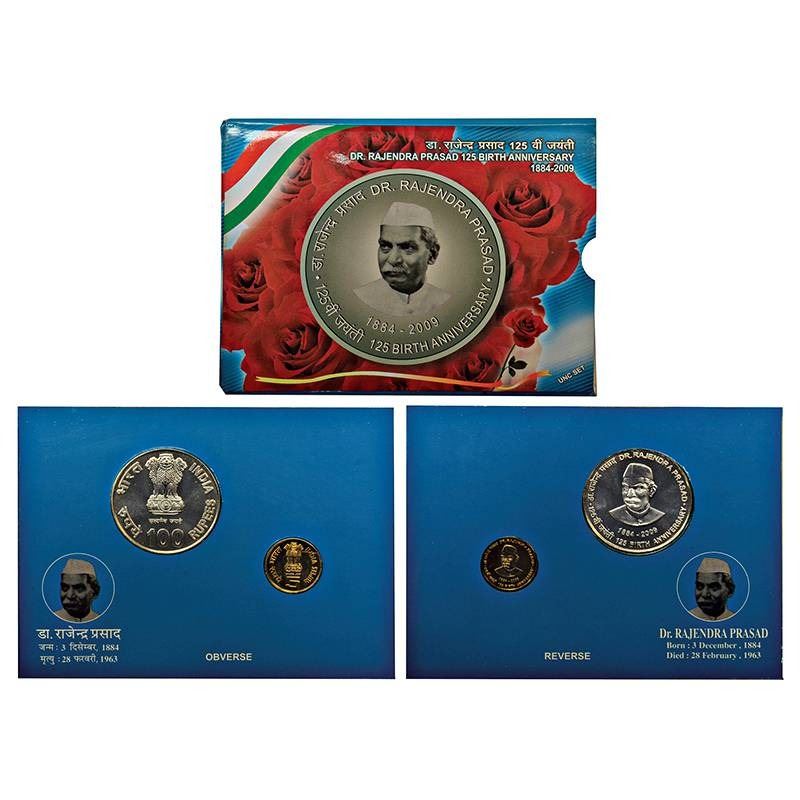 2009, Rajendra Prasad Birth Anniversary, UNC set of 2 coins, 100 rupees and 5 rupees, Kolkata mint, RB 365, in original mint packing.