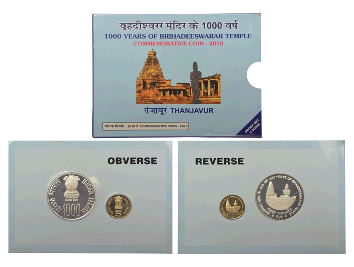 2010, 1000 year of Brihadeeswarar Temple, Proof set of 2 coins, 1000 rupees and 5 rupees, Mumbai mint, in original mint packing.