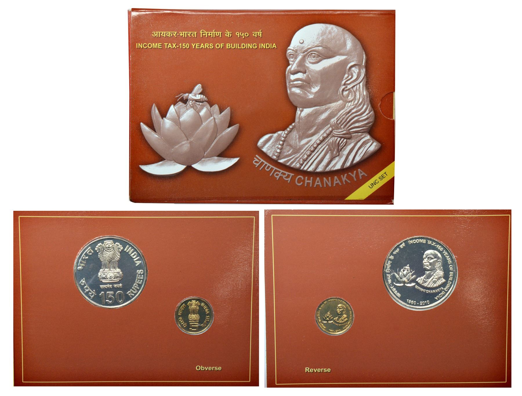 2010, Income Tax-150 Years of Building India, UNC set of 2 coins, 150 rupees and 5 rupees, Kolkata mint, in original mint packing.