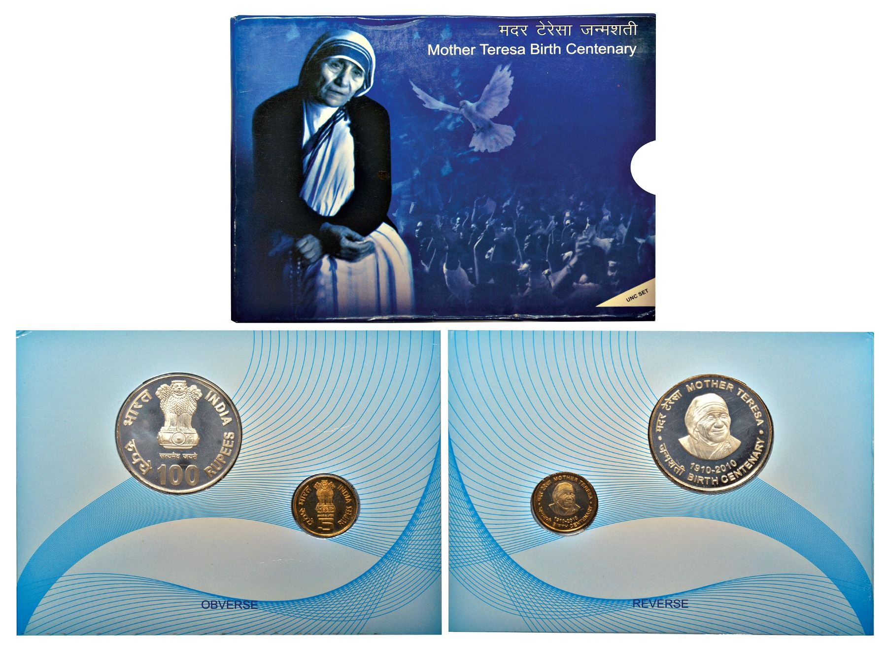 2010, Mother Teresa Birth Centenary, UNC set of 2 coins, 100 rupees and 5 rupees, Kolkata mint, in original mint packing.