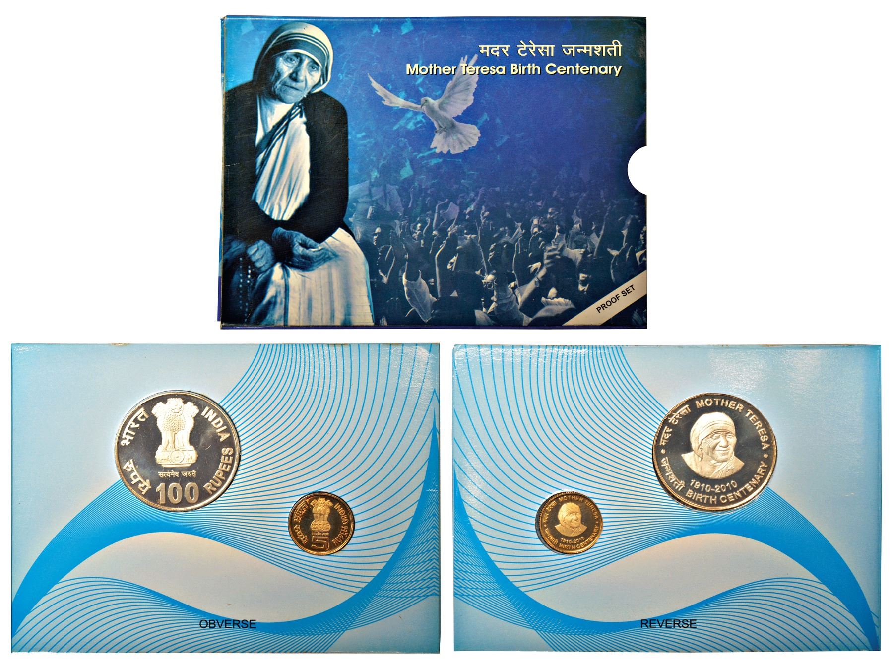 2010, Mother Teresa Birth Centenary, proof set of 2 coins, 100 rupees and 5 rupees, Kolkata mint,