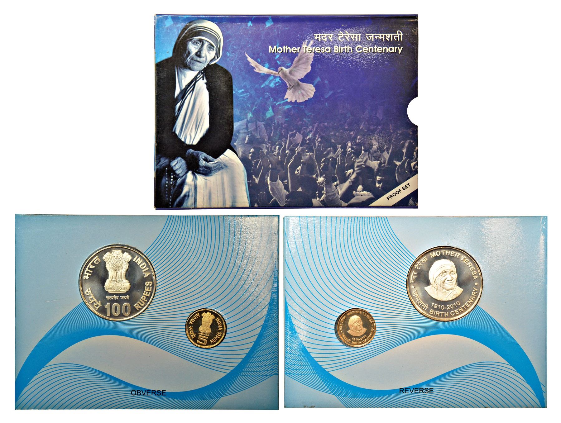 2010, Mother Teresa Birth Centenary, proof set of 2 coins, 100 rupees and 5 rupees, Kolkata mint,