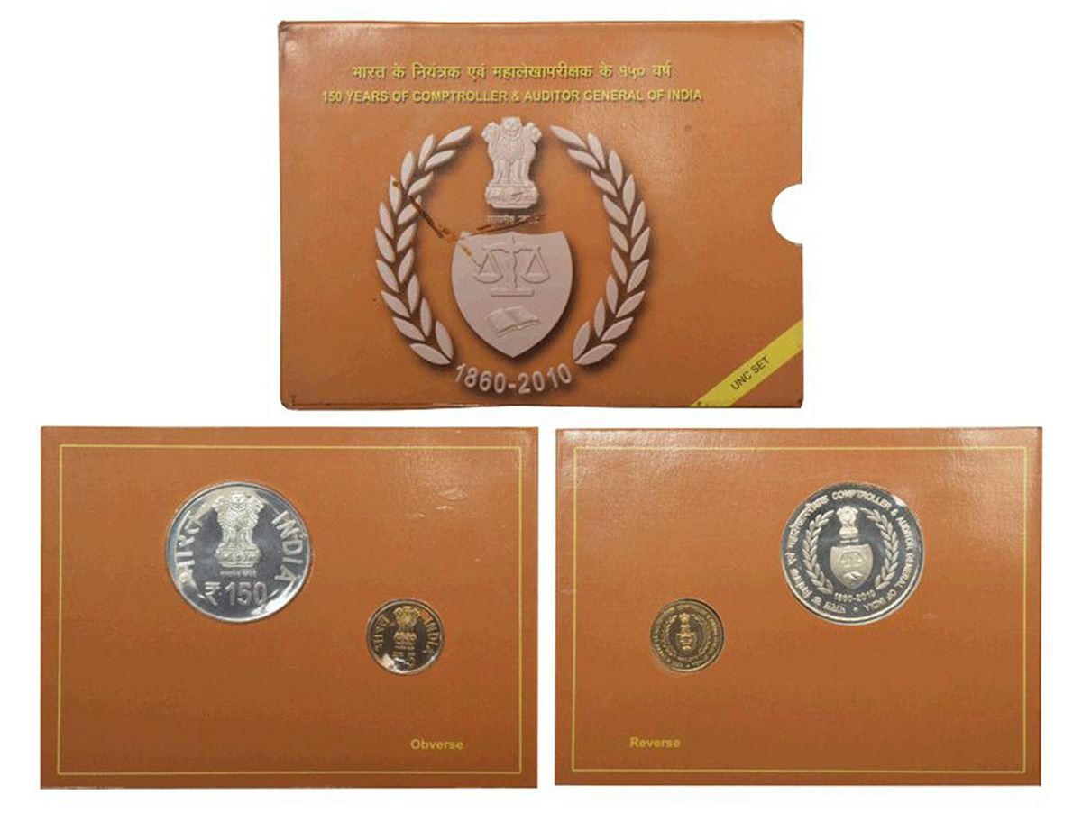 2011, 150 Years of Comptroller & Auditor General of India, UNC set of 2 coins, 150 rupees and 5 rupees, Kolkata mint, in original mint packing.