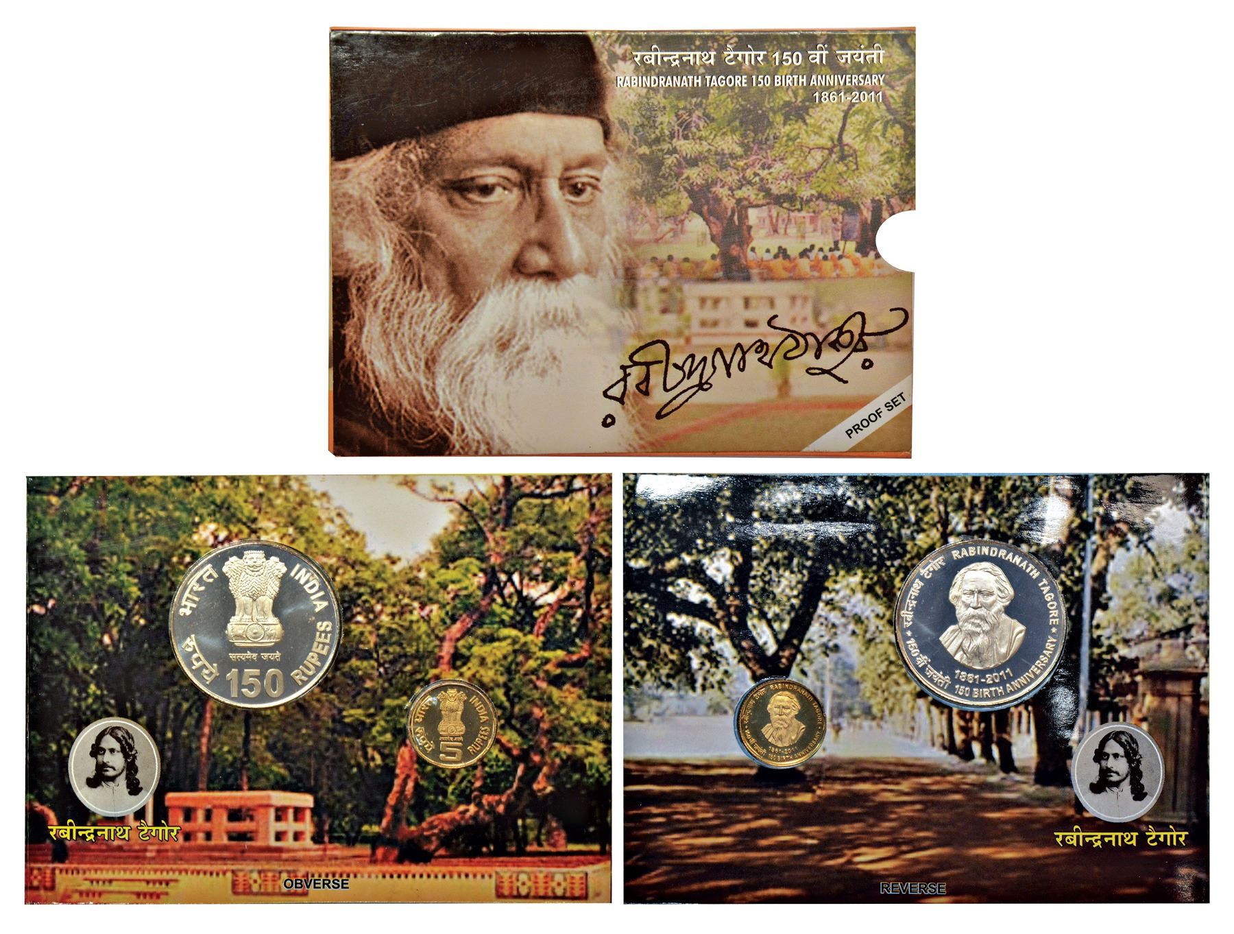 2011, 150th Birth Anniversary of Rabindranath Tagore, proof set of 2 coins, 150 rupees and 5 rupees, Kolkata mint, RB 373, in original mint packing.