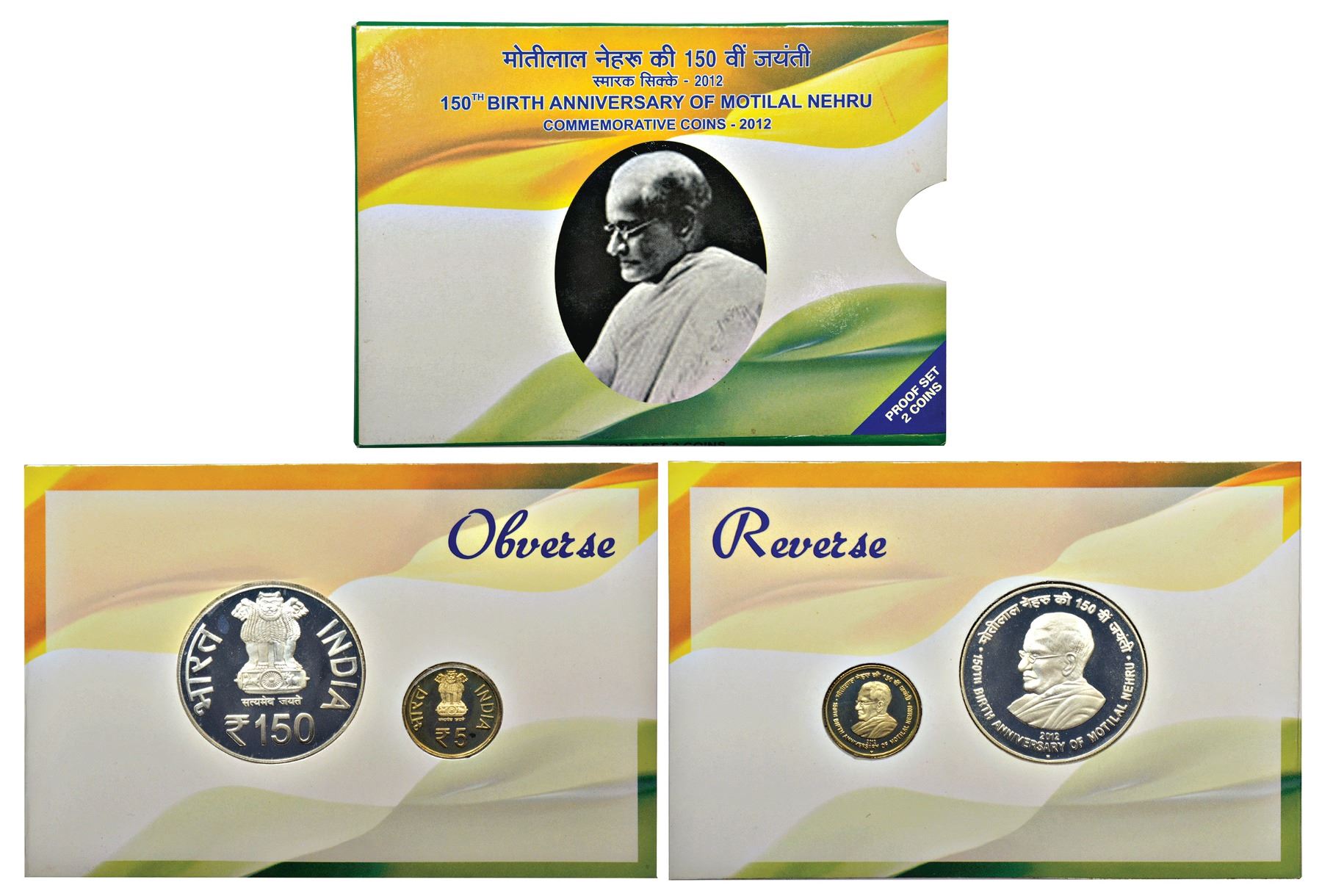 2012, 150th Birth Anniversary of Motilal Nehru, Proof set of 2 coins, 150 rupees and 5 rupees, Mumbai mint, in original mint packing.