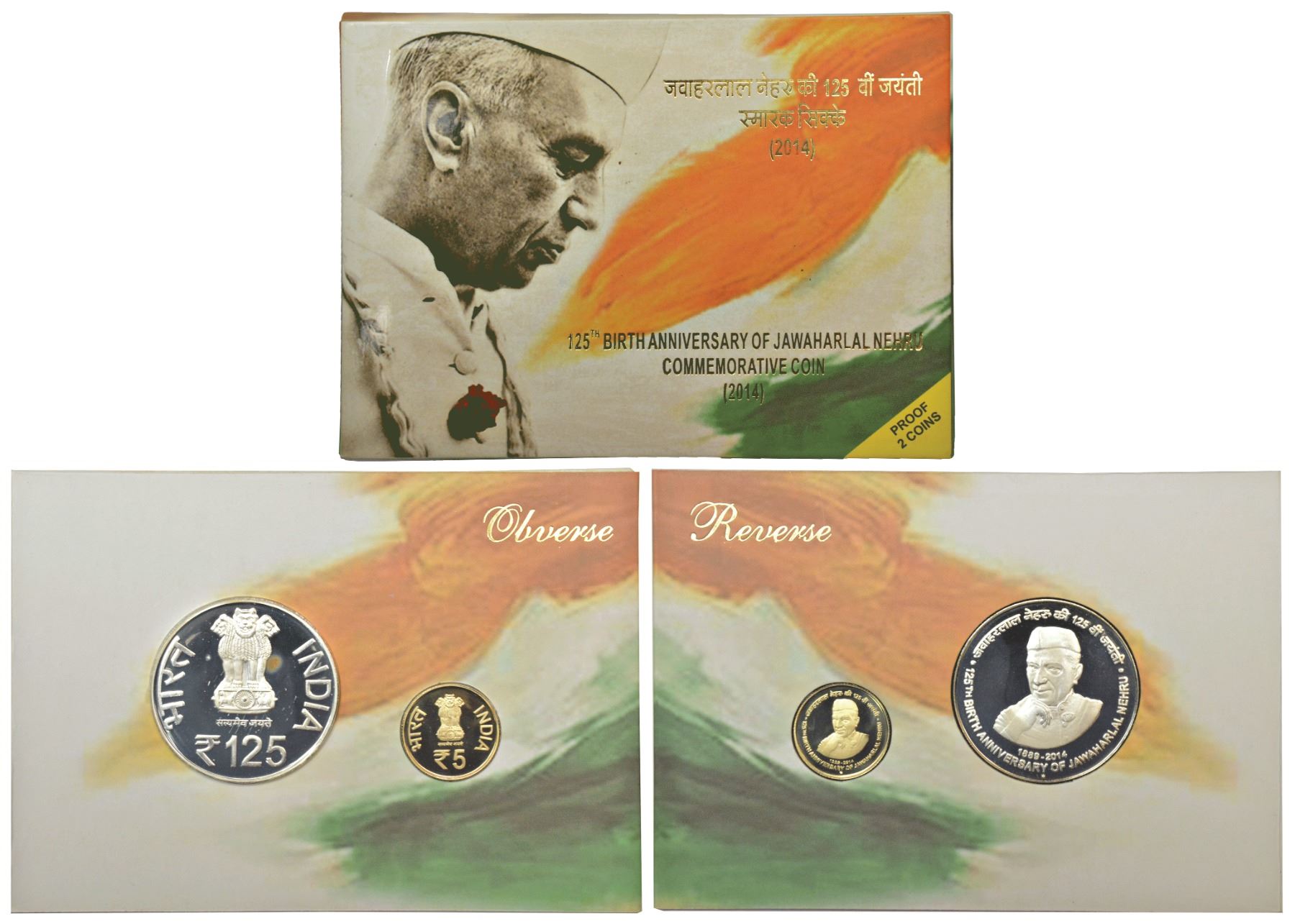 2014, 125th Birth Anniversary of Jawaharlal Nehru, proof set of 2 coins, 125 rupees and 5 rupees, Mumbai mint, in original mint packing.
