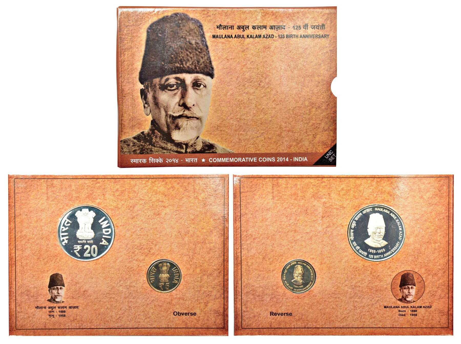 2014, 125th Birth Anniversary of Maulana Abul Kalam Azad, UNC set of 2 coins, 20 rupees and 5 rupees, Kolkata mint, in original mint packing.