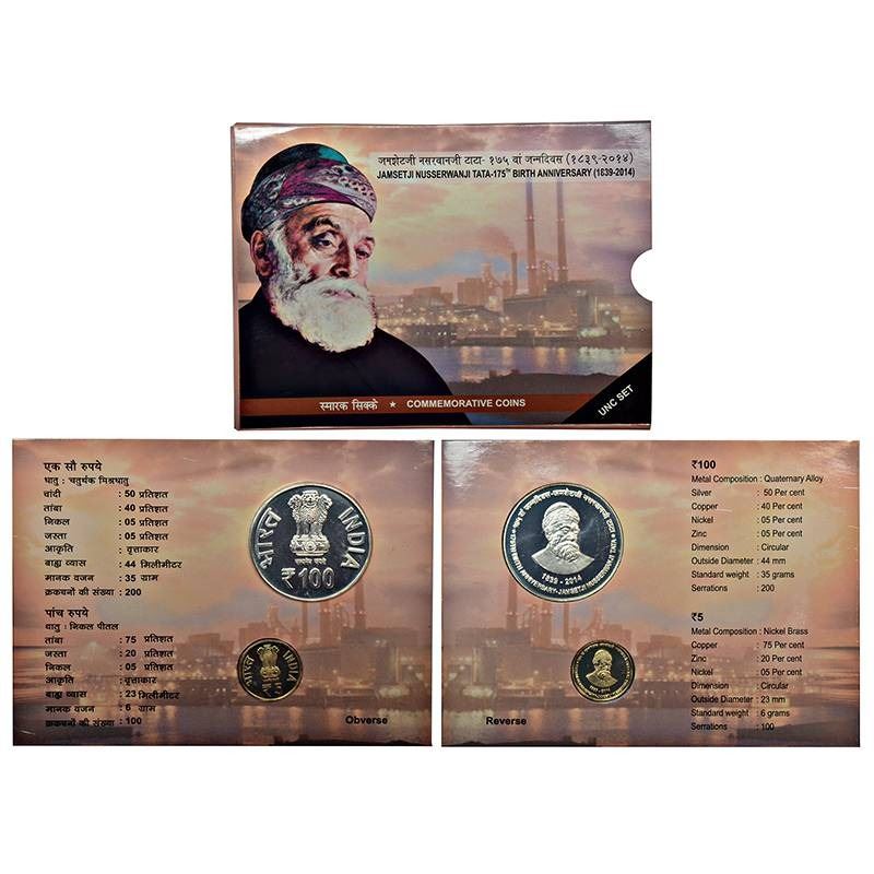 2014, 175th Birth Anniversary of Jamsetji Nusserwanji Tata, UNC set of 2 coins, 100 rupees and 5 rupees, Kolkata mint, in original mint packing.