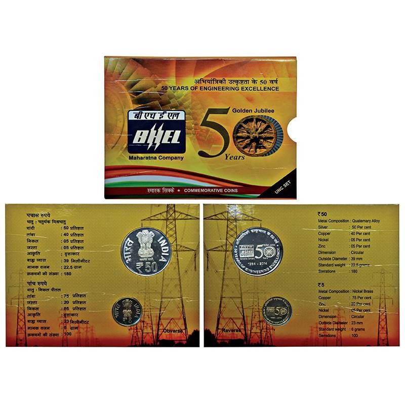 2014, 50 Years of Engineering Excellence - BHEL, UNC set of 2 coins, 50 rupees and 5 rupees, Kolkata mint, in original mint packing.