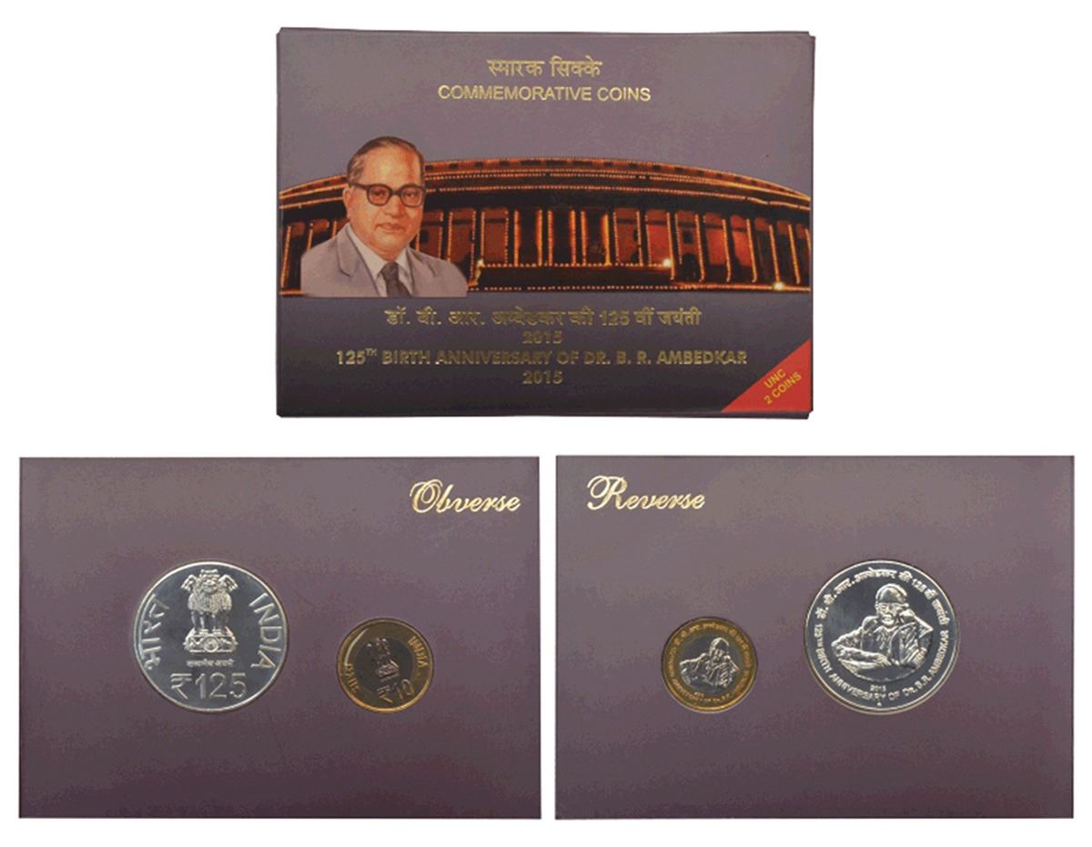 2015, 125th Birth Anniversary of Dr. B.R. Ambedkar, UNC set of 2 coins, 125 rupees and 10 rupees, Mumbai mint, in original mint packing.