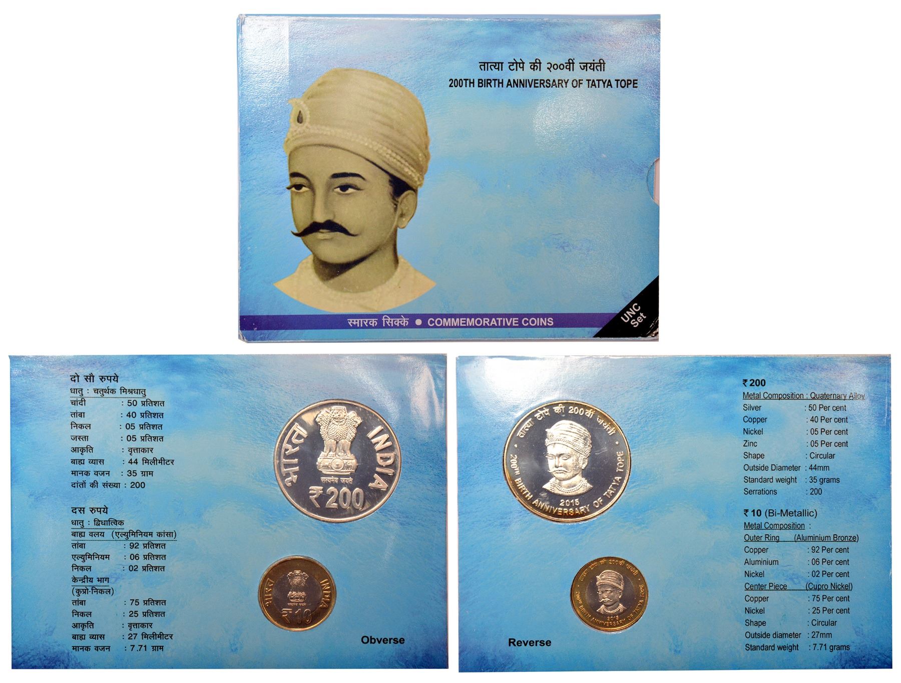 2015, 200th Birth Anniversary of Tatya Tope, UNC set of 2 coins, 200 rupees and 10 rupees, Kolkata mint, in original mint packing, minor weather effect on 200 rupees coin.