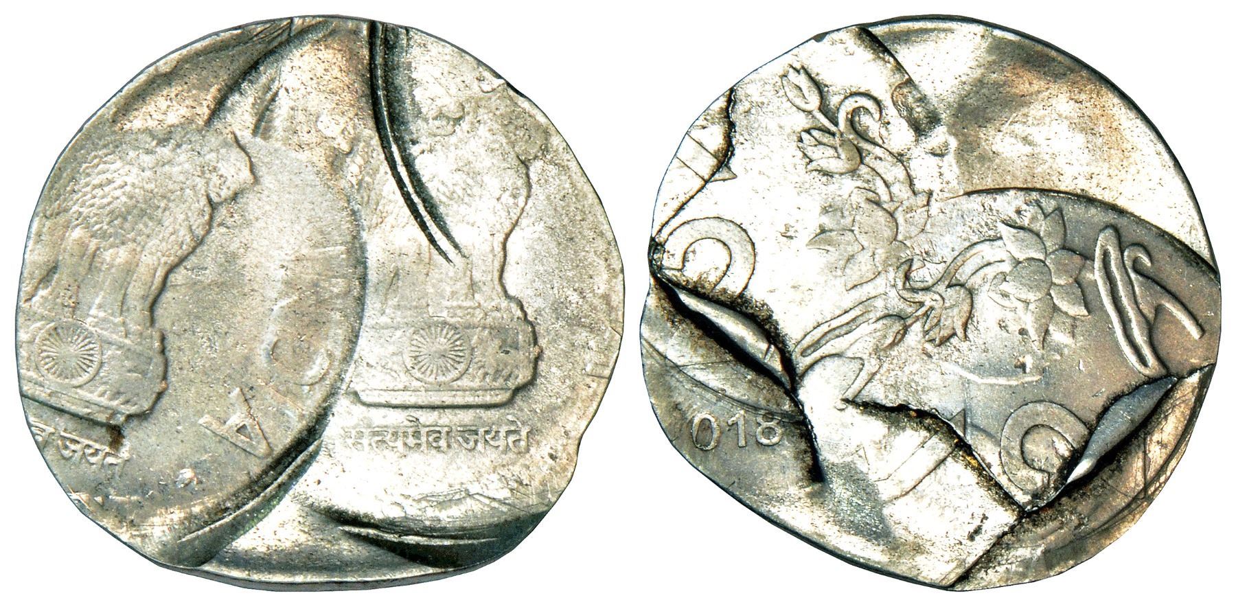 2018, Ferratic stainless steel, 2 rupees, error, off centre and multiple struck on both sides.