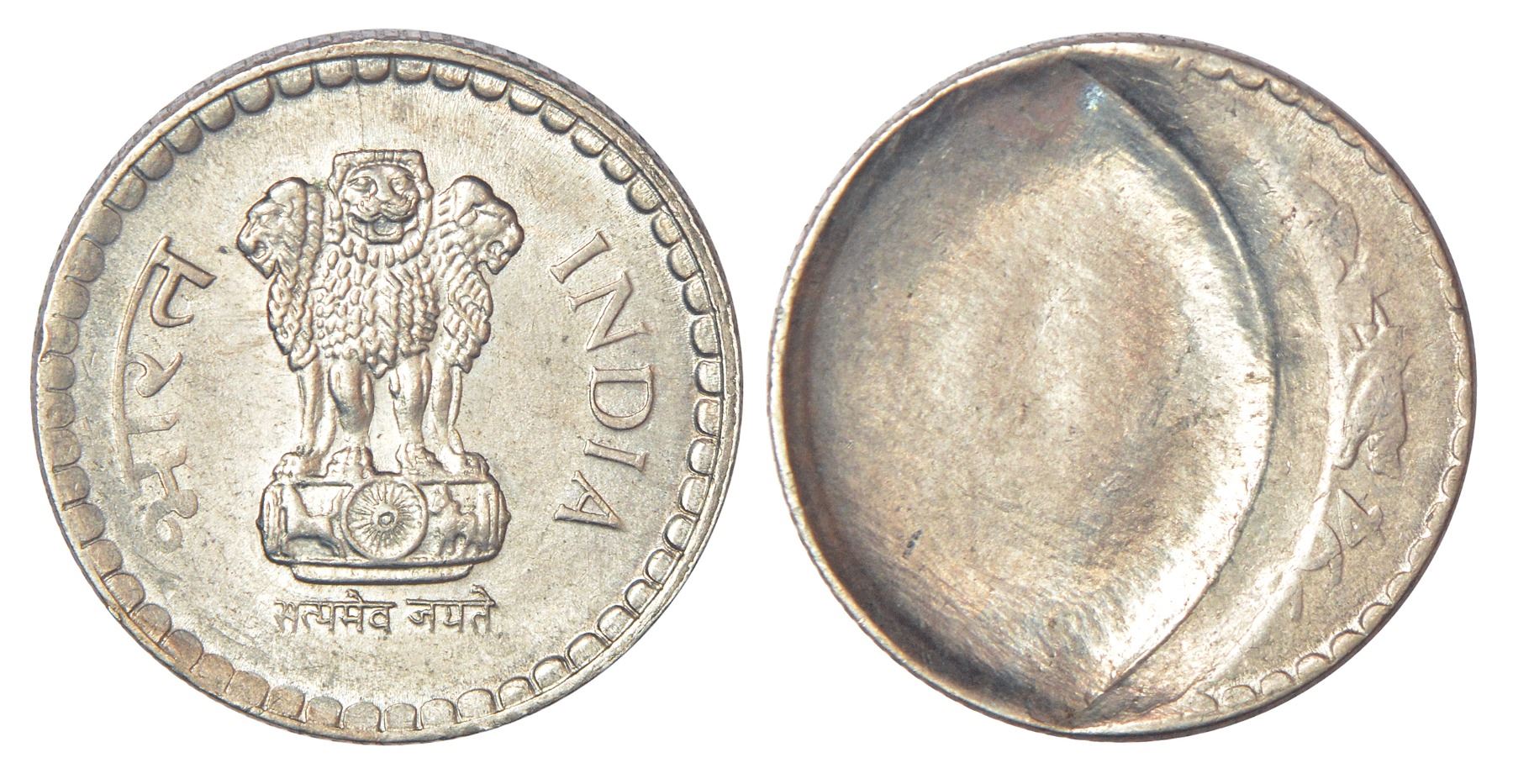 5 rupees, error, copper-nickel, 1994, Calcutta mint, misaligned die (Mad) error on reverse, 9.26g.
