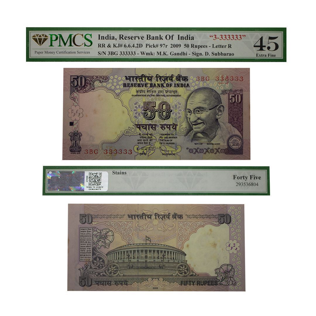 Republic India, 50 Rupees, Fancy Number- (3BG)- 333333, signed by-D. Subbarao, Graded by PMCS as 45.