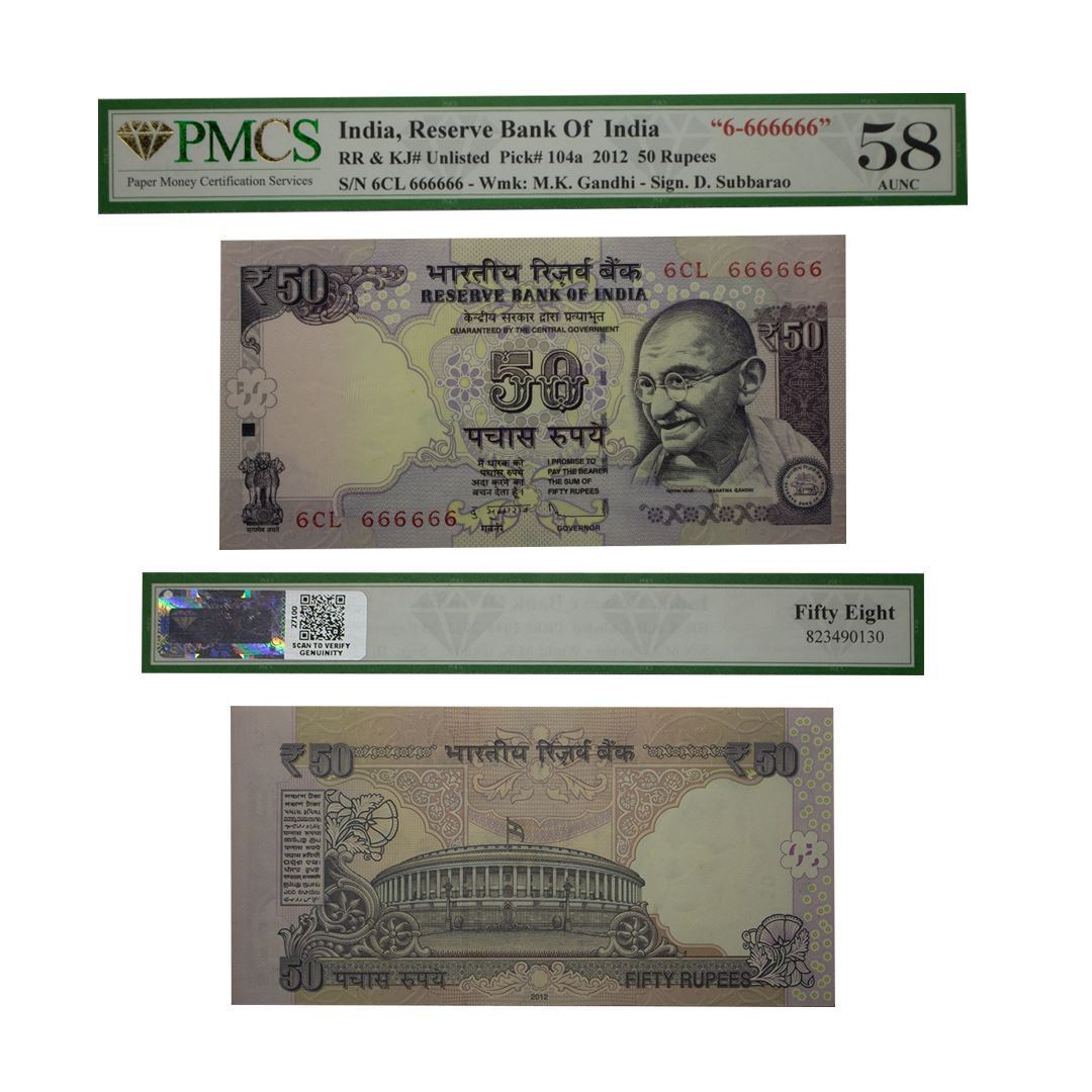 Republic India, 50 Rupees, Fancy Number- (6Cl)- 666666, signed by-D. Subbarao, Graded by PMCS as 58