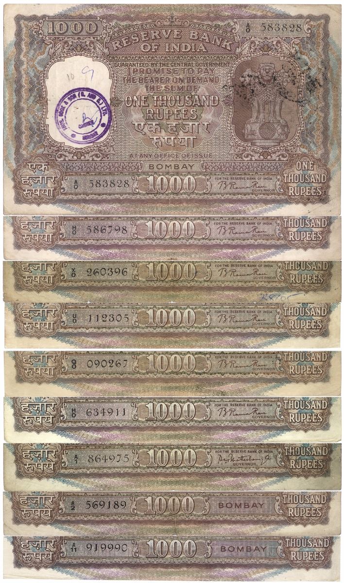 1.1954, B Rama Rau, 1st Issue, Bombay Circle, wrong hindi ek hazaar rupaya, A Prefix, S.No. A0 583828, (KJ RR # 6.9.1A)