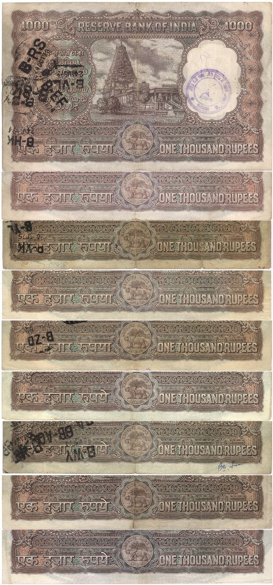 An almost complete collection of early 1000 Rupees 9 different banknotes of Brihadeswara temple of India.