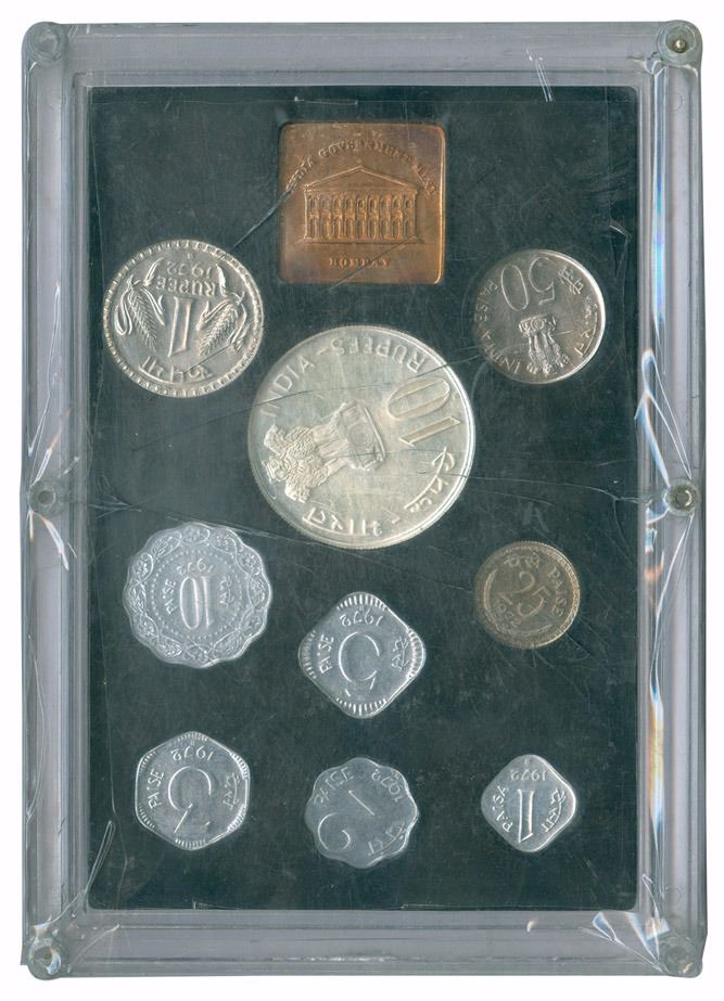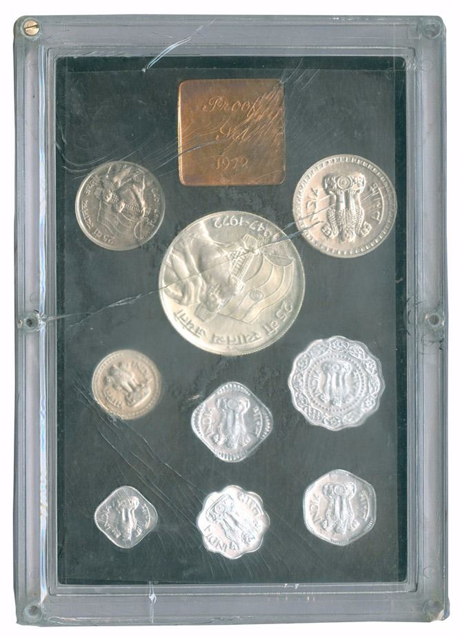 1972, Proof Set,25th Anniversary of Independence,Rupee,10 Rupees, 50 Paise, 25 Paise, 10 Paise, 5 Paise, 3 Paise, 2 Paise, Paise, Bombay Mint, (RB # 31), with certificate, acrylic case broken in original brown packing.