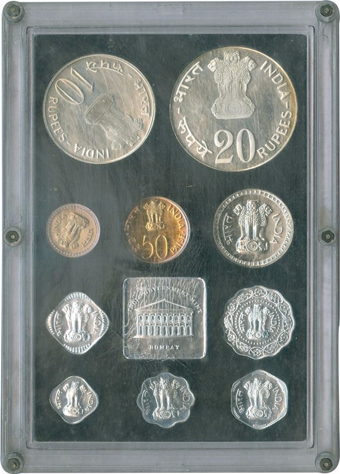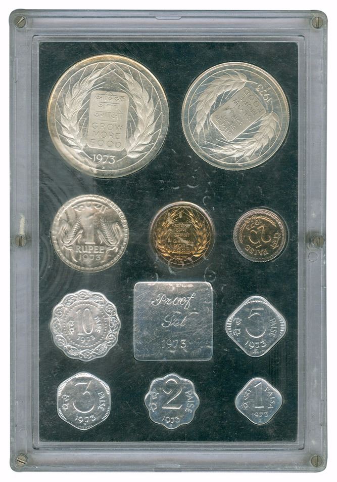 1973, Proof Set, Grow More Food, Set of 10 Coins,20 Rupee, 10 Rupee, 50 Paise, 25 Paise, 10 Paise, 5 Paise, 3 Paise, 2 Paise, Paise,(RB # 35), with certificate, acrylic case slightly damagedin origionalbrown packing.