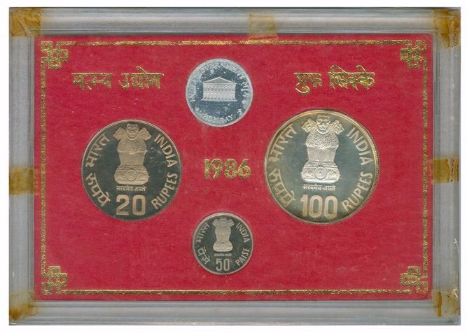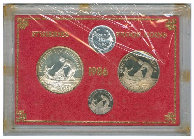 1986, Proof Set, Fisheries, 100 Rupees, 20 Rupees, 50 Paise, Bombay Mint, (RB # 122)intact condition, acrylic casein origionalbrown packing.