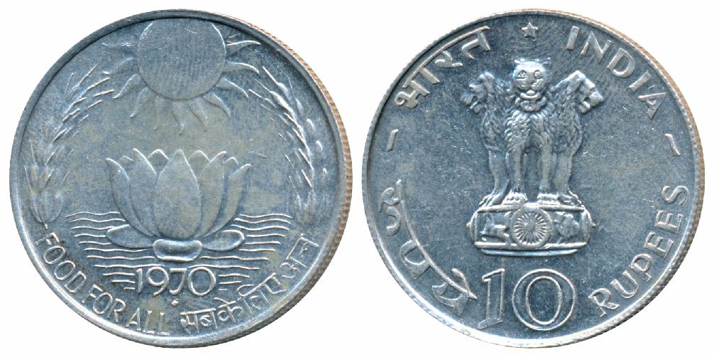 Silver Rupees 10, 1970, Bombay Mint, Food for All (KM 186). About Uncirculated.