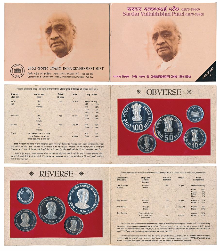 1996 Proof Set, Sardar Vallabhbhai Patel, set of 4 pcs., Rupees 2 to 100. In immaculate condition, but without outer packaging, Rare. (4)