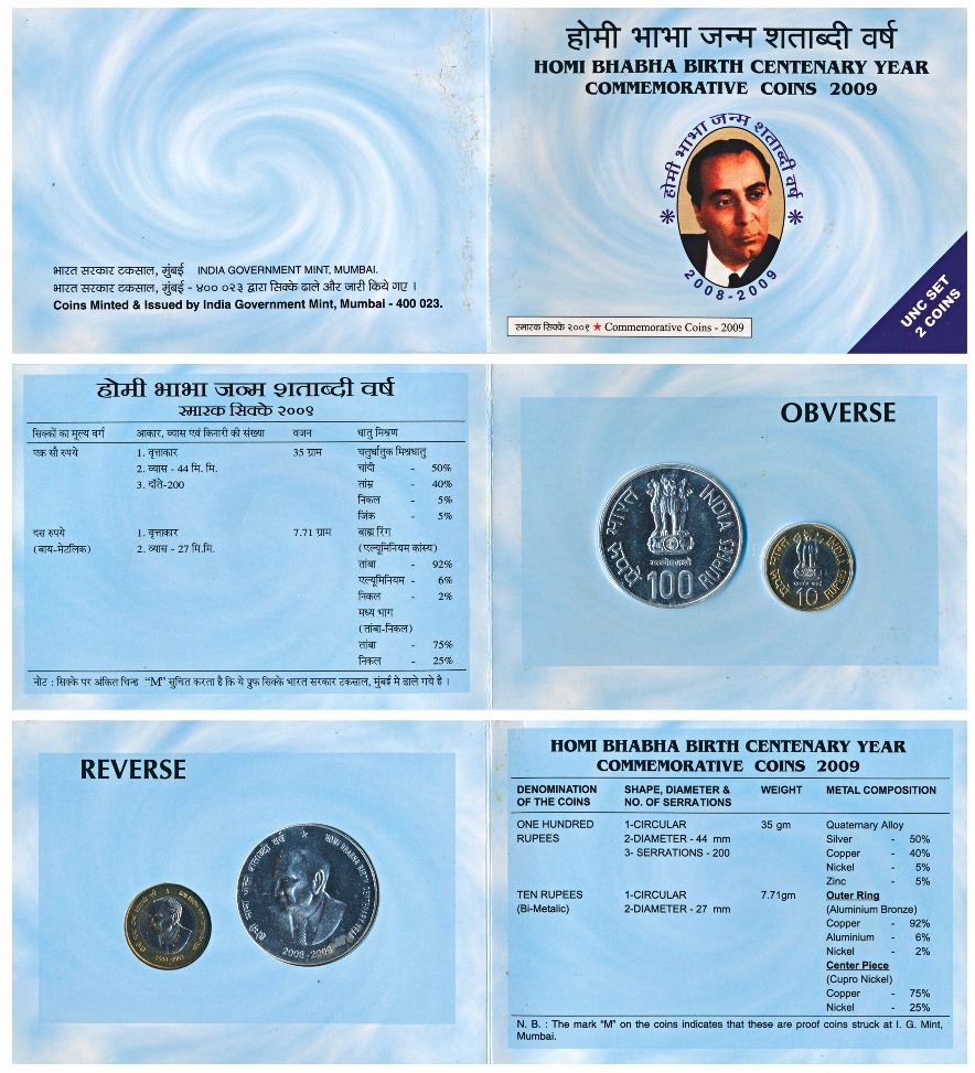 2009 Uncirculated set, Homi Bhabha Birth Centenary, set of Rupees 10 (bi-metal) and 100. In immaculate condition, within original packaging. (2)