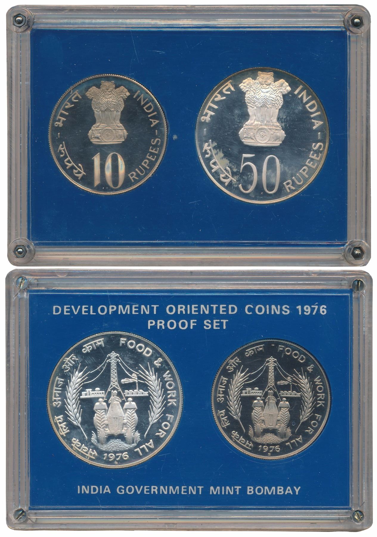 1976, Proof Set of 2, Rupees 50 & 10, "Food & Work for All", Bombay Mint, in acrylic case. With detail card but without outer box.