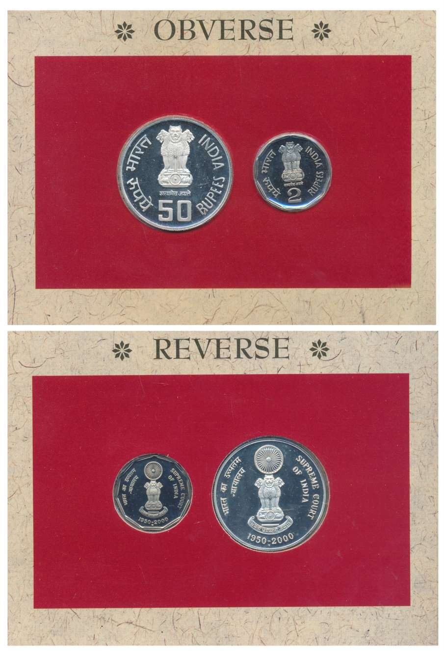 2000, Proof Set of 2 coins, "Golden Jubilee of Supreme Court", Mumbai Mint, Rupees 50 & 2 (RB# 233). In blister pack.