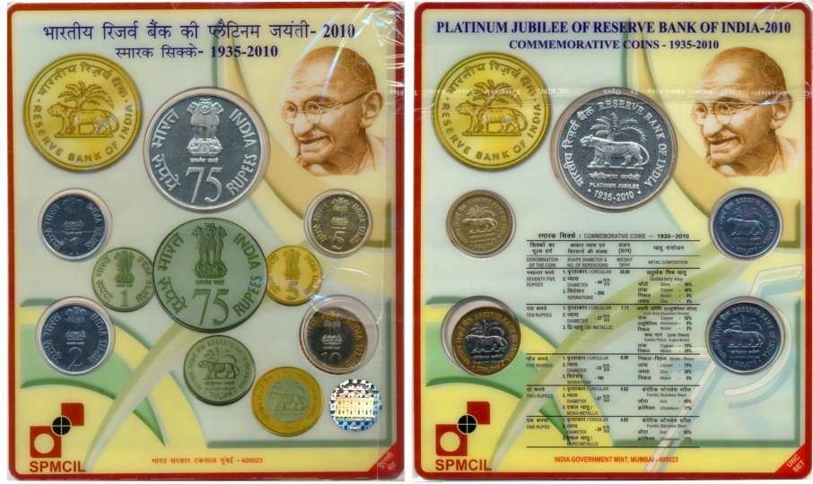 2010, Uncirculated set of 5, “Platinum Jubilee of Reserve Bank of India”, Mumbai Mint, Rupees 75, 10, 5, 2 & 1 (RB# 369). In blister pack.