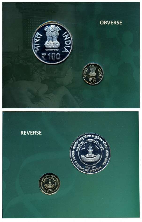 2011, Uncirculated set of 2, “Centenary of ICMR”, Mumbai Mint, Rupees 100 & 5, in blister pack.